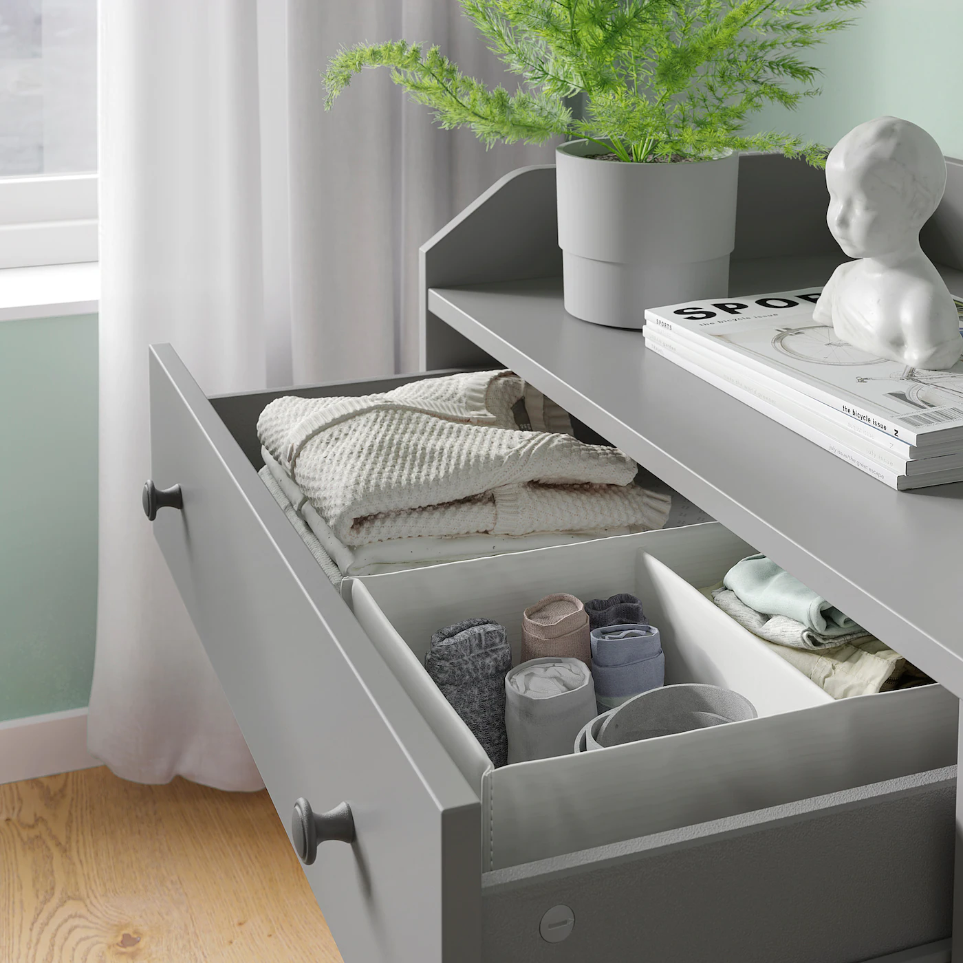 A wide chest of drawers gives you plenty of storage space as well as room for lamps or other items you want to display on top. Hide or display your things by combining open and closed storage. You get a good overview and can easily reach your clothes. You get a handy place to hang your bags, bathrobe and accessories on on the side of the wardrobe by adding SKOGSVIKEN hooks for door. If you want to organize inside, you can complement with interior accessories from the STUK series.Material