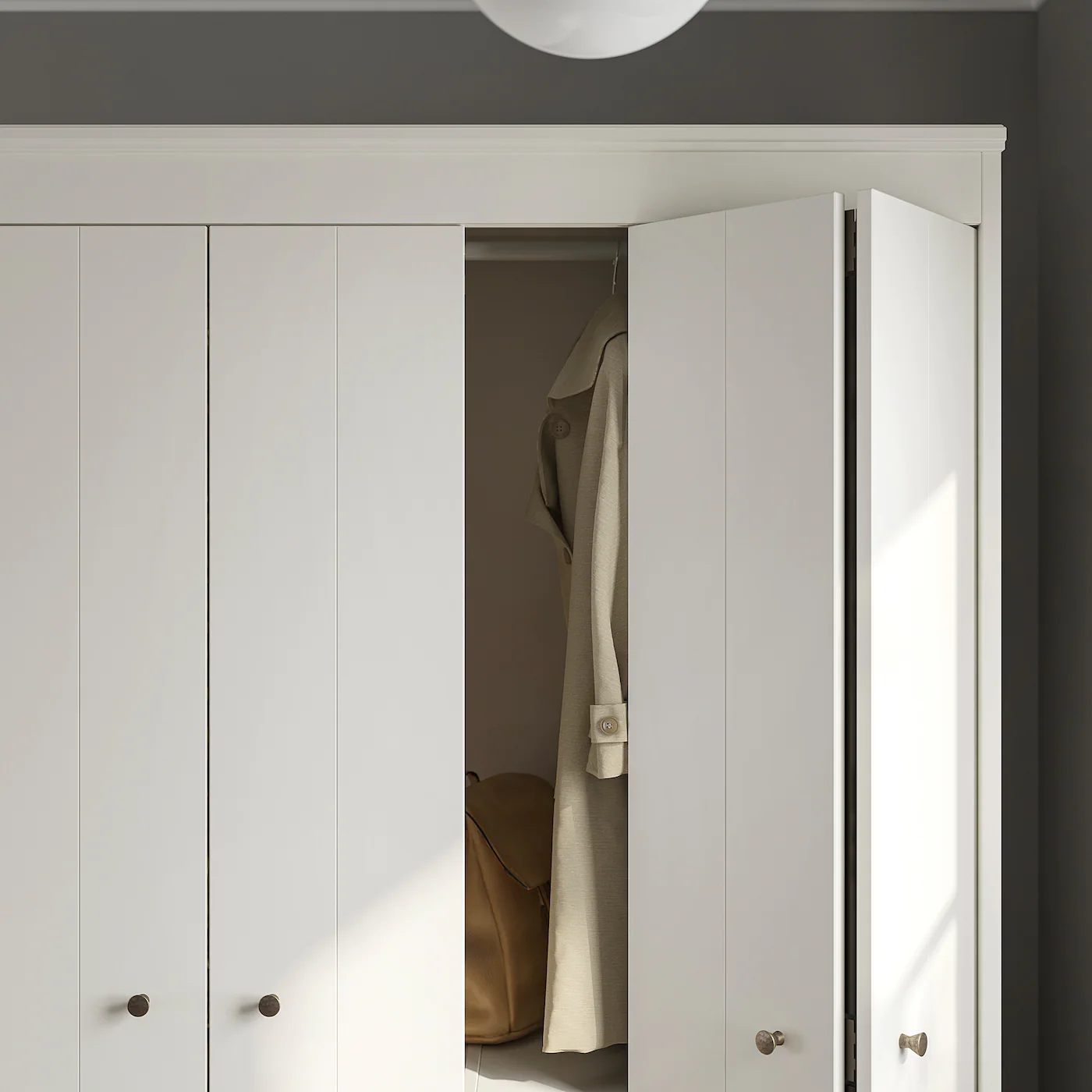 Folding doors allow more room for furniture because they don’t take any space to open. Adjustable shelves make it easy to customize the space according to your needs. Perfect for folded as well as long and short hanging clothes. Perfect on its own or combined with other furniture in the IDANÄS series depending on your space and needs. The assembly of this product is simplified thanks to the wedge dowel that clicks into pre-drilled holes.Material