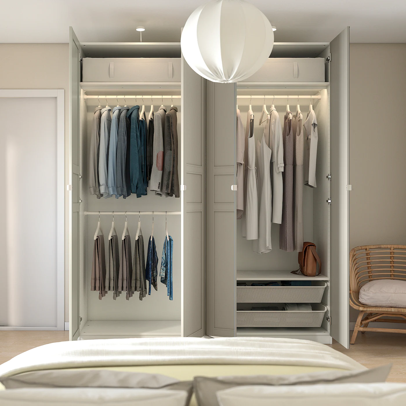You can easily adapt this ready-made PAX/KOMPLEMENT combination to suit your needs and taste using the PAX planning tool. Adjustable feet make it possible to compensate for any irregularities in the floor. The soft-opening/closing devices catch the running doors so that they open and close slowly, silently and softly. With the PAX Planner, you can easily complete your combination with integrated lighting. After choosing the light source, the planner will work out which accessories you need to complete the solution. Do you know it’s easy as pie to move around the inside organizers after taste, or change them later on? With small changes you can alter the storage solution to fit your clothes, instead of the other way around. The mesh basket allows air to circulate and is perfect for storing your folded clothes, socks or accessories. This solution will hold at least 120 clothes hangers – and that’s just what you will fit on the clothes rails!Material