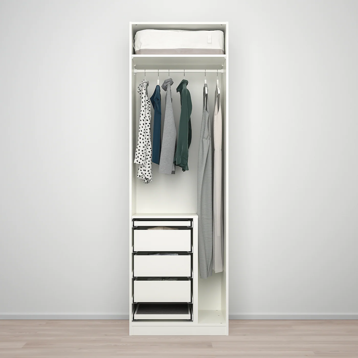 You can easily adapt this ready-made PAX/KOMPLEMENT combination to suit your needs and taste using the PAX planning tool. Adjustable feet make it possible to compensate for any irregularities in the floor. Hinges with integrated dampers catch the door and close it slowly, silently and softly With the PAX Planner, you can easily complete your combination with integrated lighting. After choosing the light source, the planner will work out which accessories you need to complete the solution. Thanks to the smart divider, there’s space for both long and short clothes on a hanger, without loosing the storage space underneath the short ones. Feeling even more organized? Complement the drawers with KOMPLEMENT boxes, they can be combined to fit perfectly so that you can utilize the drawer fully. A room immediately feels larger, lighter and more spacious by choosing mirror doors. A great way of transforming a narrow hallway or a tiny bedroom.Material