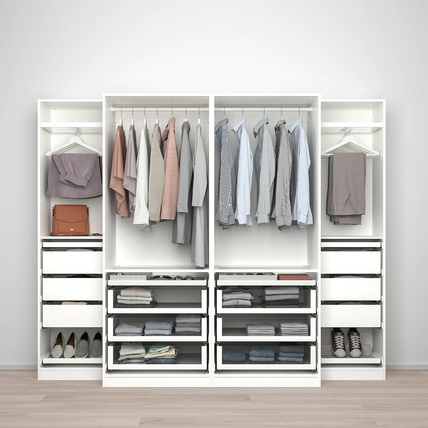 You can easily adapt this ready-made PAX/KOMPLEMENT combination to suit your needs and taste using the PAX planning tool. Adjustable feet make it possible to compensate for any irregularities in the floor. Sliding doors allow more room for furniture because they don’t take any space to open. The soft-opening/closing devices catch the running doors so that they open and close slowly, silently and softly. With the PAX Planner, you can easily complete your combination with integrated lighting. After choosing the light source, the planner will work out which accessories you need to complete the solution. Deep frames that will swallow a lot of clothes. Enough depth to hang clothes on the side and plenty of space in drawers. Glass fronted drawers for a nice overview of what’s stored in them, while regular drawers let’s you hide away other pieces. Lots of drawers which means you can separate everything down to the tiniest sock and save some time looking for stuff. Feeling even more organized? Complement the drawers with KOMPLEMENT boxes, they can be combined to fit perfectly so that you can utilize the drawer fully. Turn the panel over to change the look – each side has a different finish. Go for a unified look or mix.Material