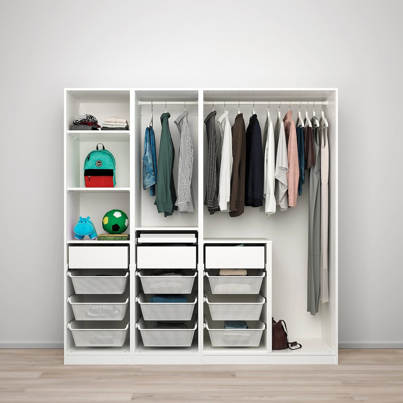 You can easily adapt this ready-made PAX/KOMPLEMENT combination to suit your needs and taste using the PAX planning tool. Adjustable feet make it possible to compensate for any irregularities in the floor. Sliding doors allow more room for furniture because they don’t take any space to open. The soft-opening/closing devices catch the running doors so that they open and close slowly, silently and softly. With the PAX Planner, you can easily complete your combination with integrated lighting. After choosing the light source, the planner will work out which accessories you need to complete the solution. Thanks to the smart divider, there’s space for both long and short clothes on a hanger, without loosing the storage space underneath the short ones. The mesh basket allows air to circulate and is perfect for storing your folded clothes, socks or accessories. The sliding doors do not require knobs or handles. This creates a timeless expression that is easy to combine with different styles.Material