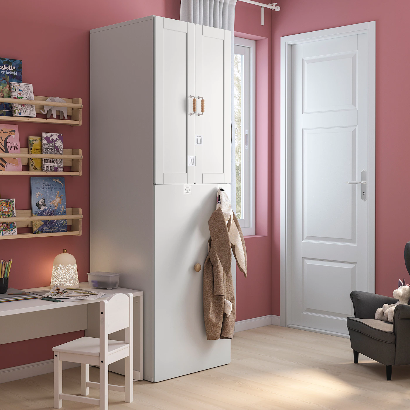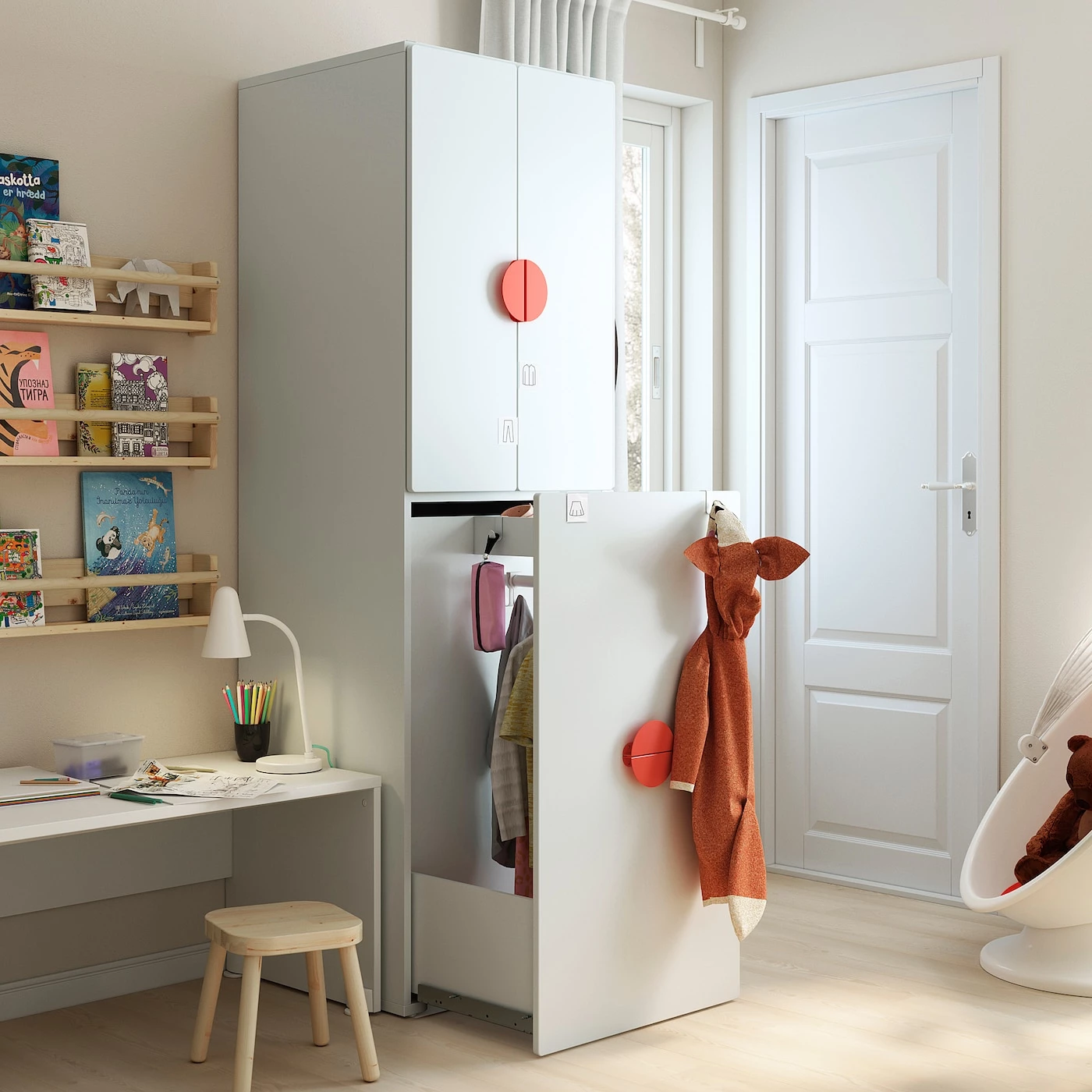 With hooks on the inside and outside, it’s easier to hang clothes, backpacks and other things that would otherwise end up in a pile on the floor. At the bottom of the pull-out storage there is a box for everything that needs to be quickly cleared away. The upper wardrobe has 1 clothes rail – the older a child gets, the more of the wardrobe they can keep organised on their own.Material